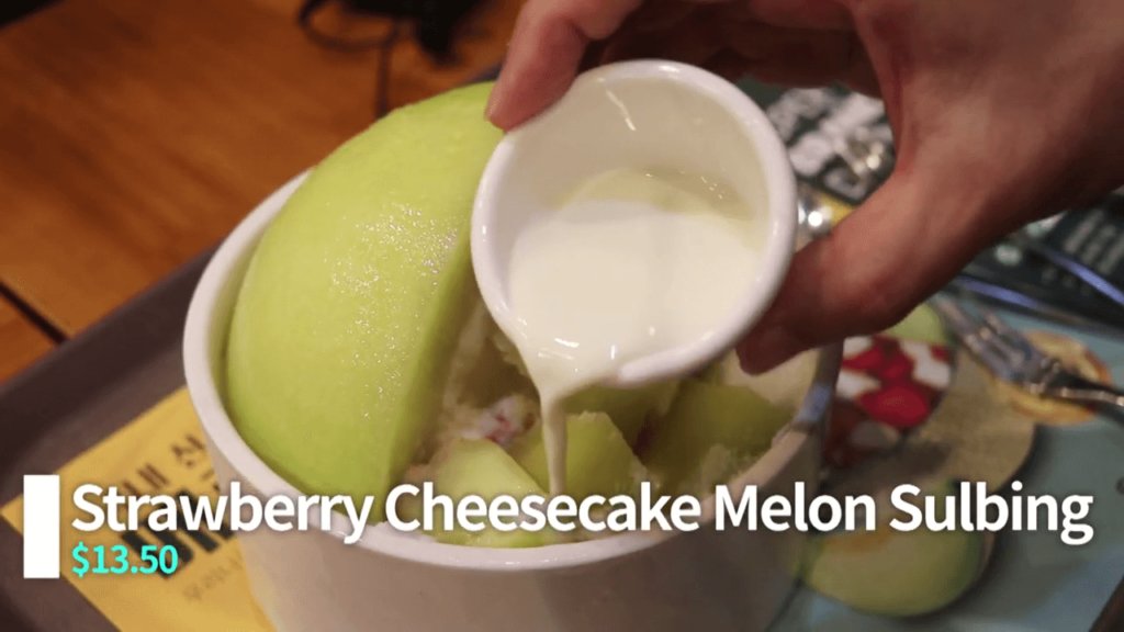 - The name of the Binsu : Strawberry Cheesecake Honeydew Melon Sulbing, 딸기치즈메론설빙, $12.50