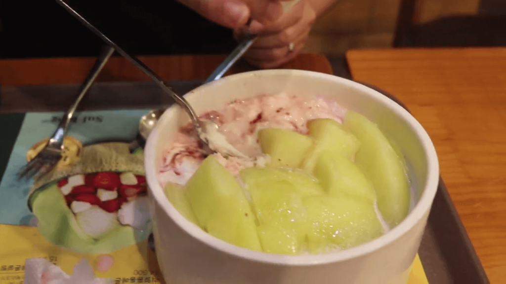 This bingsu contains fresh melon on top and ice flakes inside. Under the ice flakes, there are strawberries and cheesecake. Moreover, there is yogurt ice cream in it.